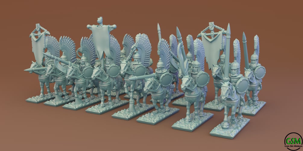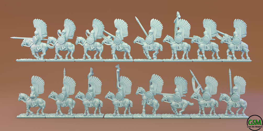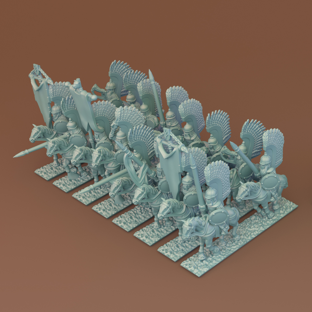 Winged Lancers Cavalry in 10 mm scale. Files are provided fully pre-supported and ready-to-print resin 3D printer. 8 stripes and 16 unique solo figures. Also included are models without support and bases.