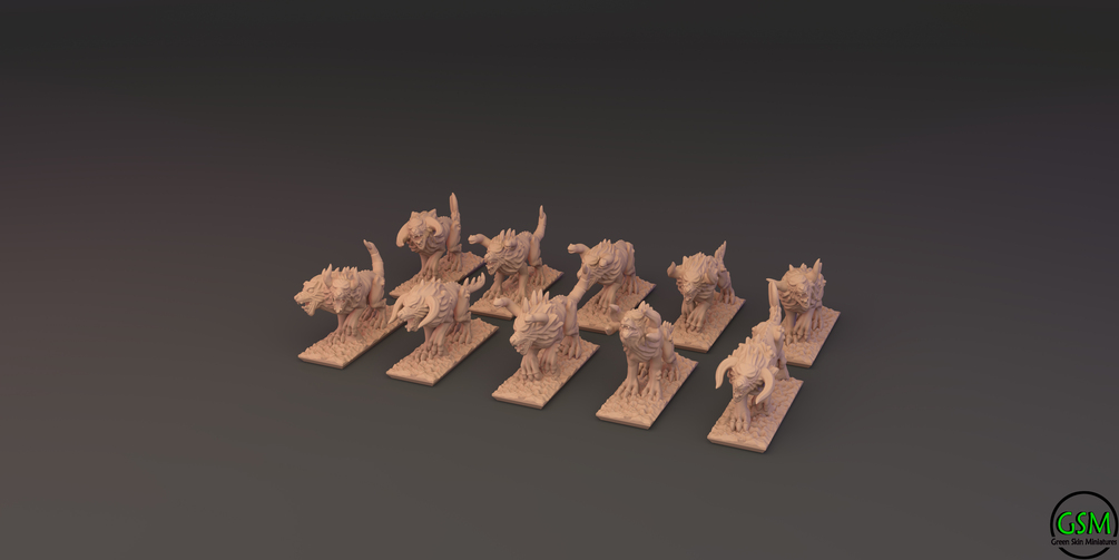 Chaos Hounds in 10 mm scale. Files are provided fully pre-supported and ready-to-print resin 3D printer. 7 stripes of Beast Herd and 10 solo figures. Also included are models without support and bases.