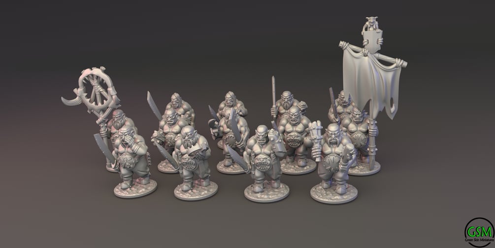 Ogres in 10 mm scale. Files are provided fully pre-supported and ready-to-print resin 3D printer. The package includes 13 unique solo figures. Also included are models without support and bases.
