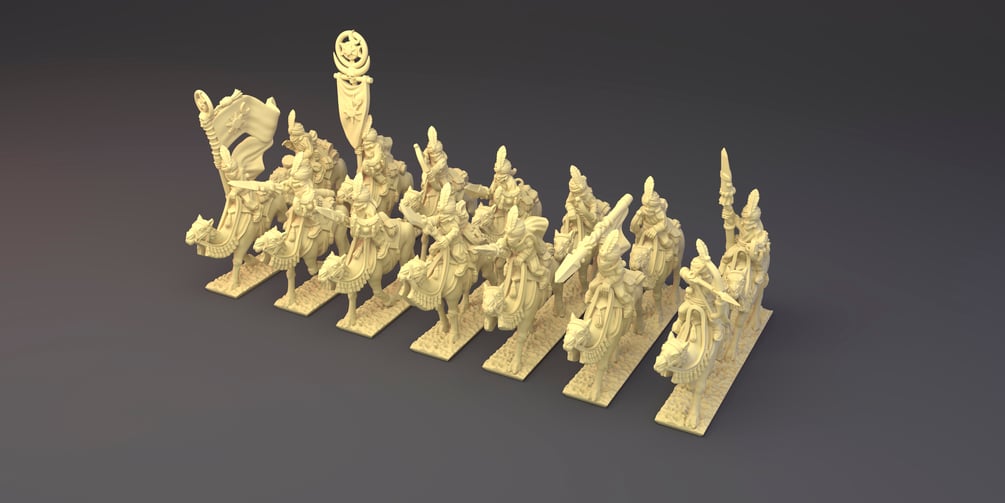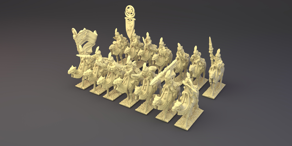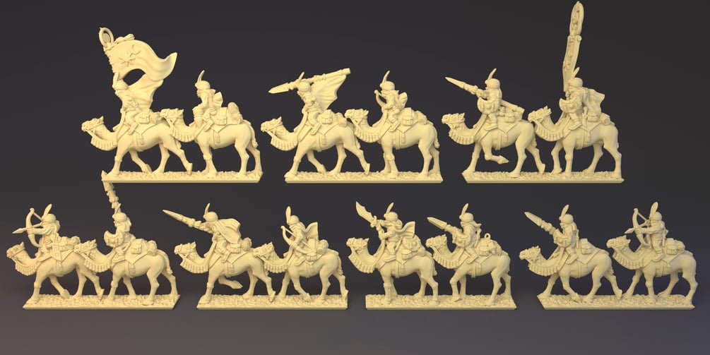 Camel Riders in 10 mm scale. Files are provided fully pre-supported and ready-to-print resin 3D printer. Seven stripes Camel Riders and 14 solo figures. Also included are models without support and bases.