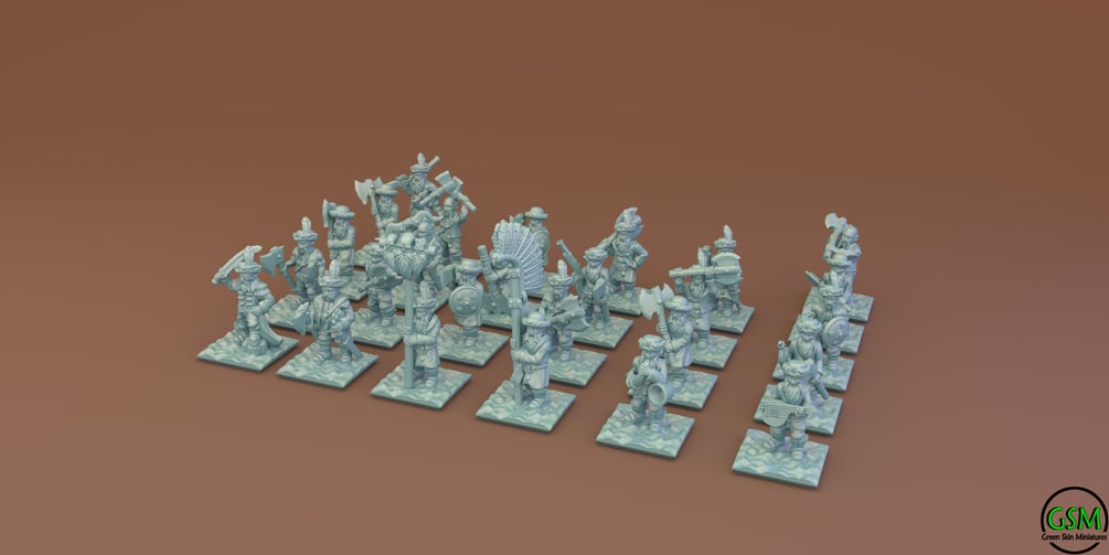 Axemen-Infantry in 10 mm scale. Files are provided fully pre-supported and ready-to-print resin 3D printer. 7 stripes and 26 unique solo figures. Also included are models without support and bases.